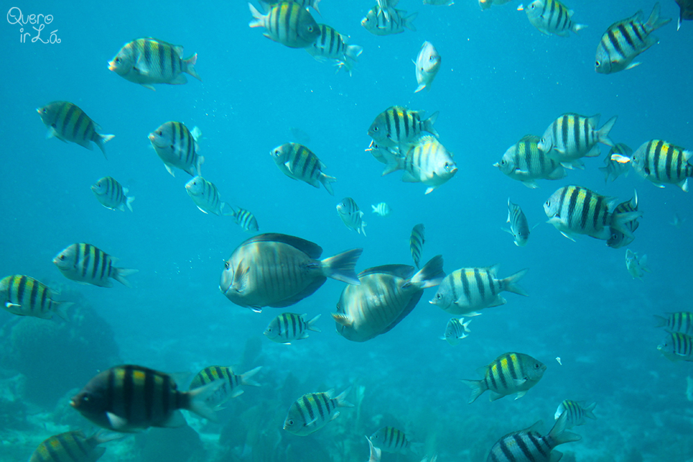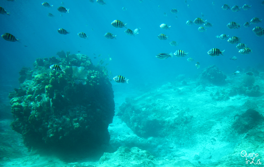 Nesse período, já pós-manhã, não há muita diversidade de espécies. O que reina são peixinhos listrados que, se não me engano, chamam-se sargentos. O guia vai explicando sobre as formações de corais e a vida dos animais marítimos. Segundo ele, de manhã é possível ver polvo, lula, tartaruga e até tubarão. O passeio dura pouco mais de uma hora e custa salgados U$47,00 por pessoa. Imagino que fechando fora do cruzeiro seja um pouco menos caro.