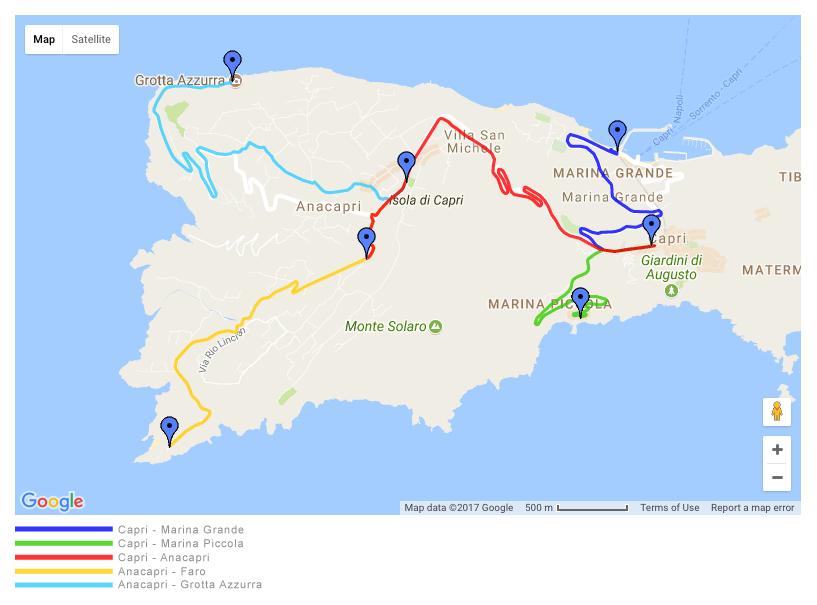 O mapa abaixo mostra todas linhas existentes, então se quer ir de Capri para a Gruta Azul por exemplo, deve pegar um ônibus de Capri para Anacapri e depois de lá para a Gruta.